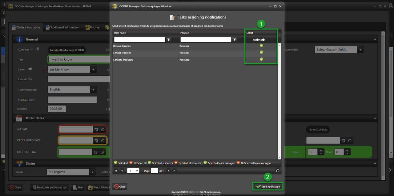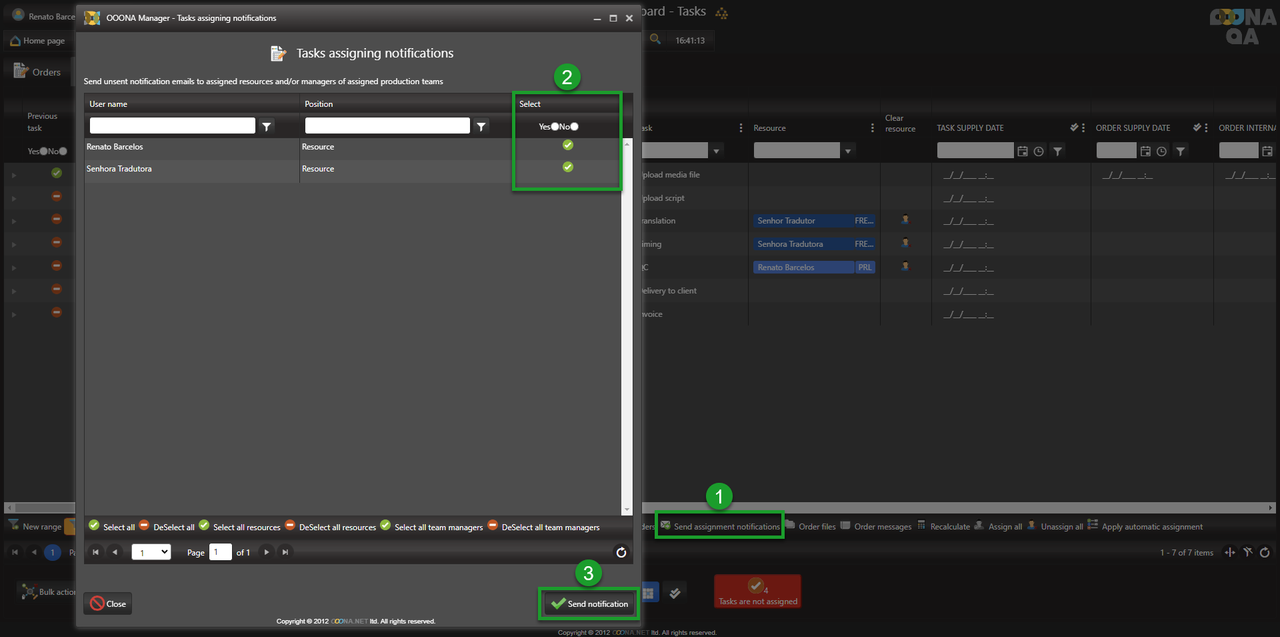 If ON, changing an order status will show a prompt confirming what resources should be notified of the assigned tasks. Once the selection is complete, click “Send notification”.