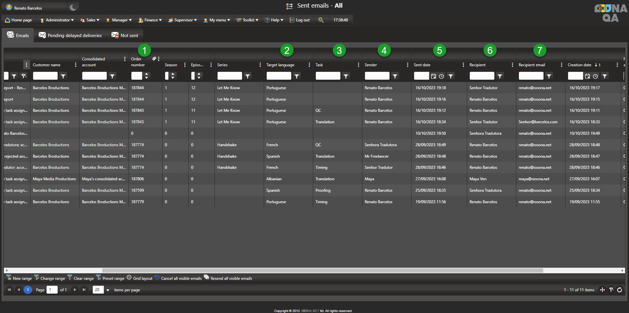 In this page, it is possible to confirm the “sent status” of a notification for a given order (1), language (2) and step (3), who triggered it (4), when it was sent (5) and the recipient’s name (6) and email (7).