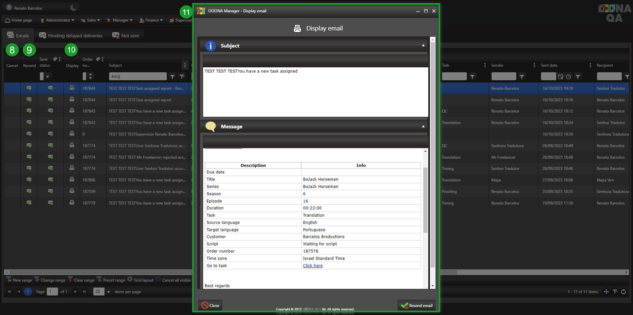 Additionally, this page also allows us to cancel undelivered emails, resend them (9) or view the email that was sent (10 & 11).
