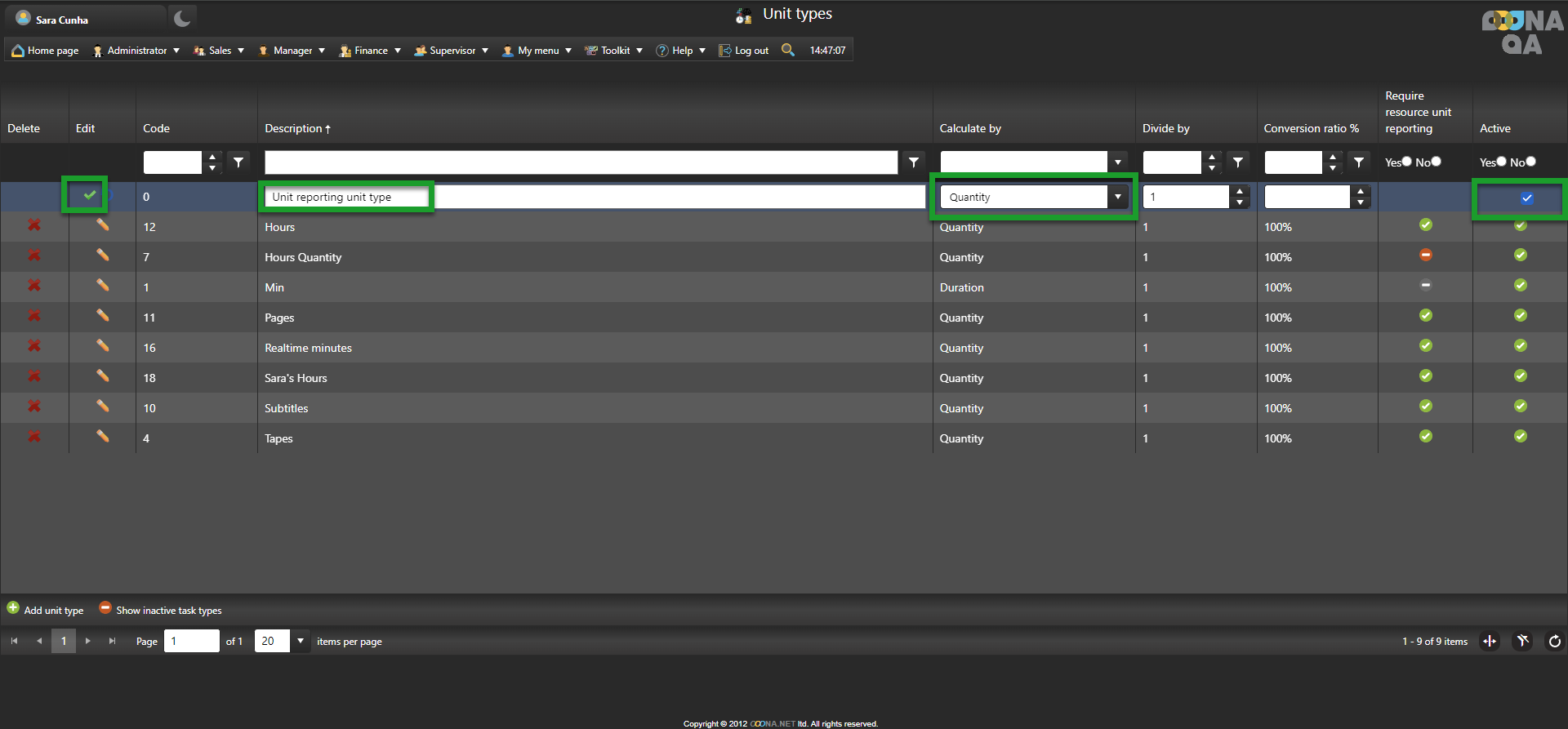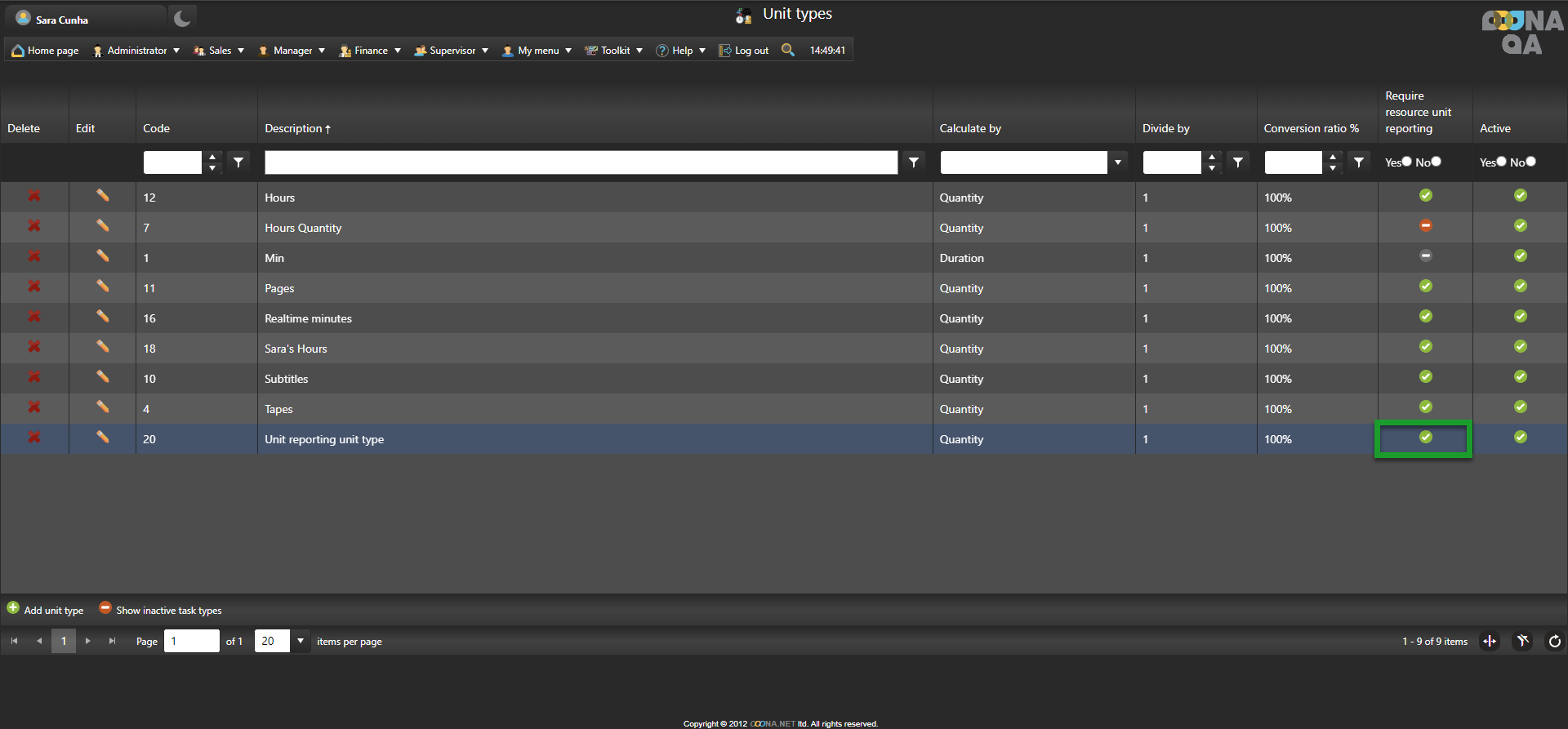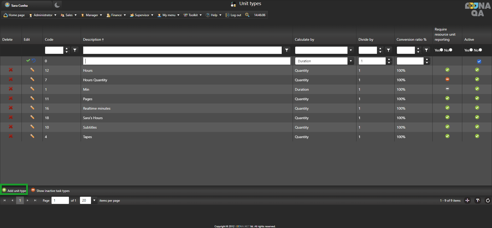 If there is no unit type calculated by quantity and with “Require resource unit reporting” enabled, a new unit type needs to be created.