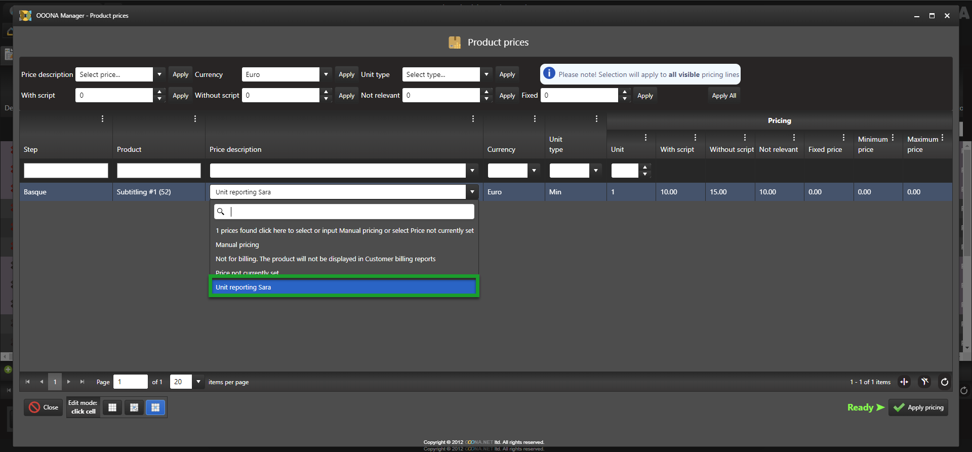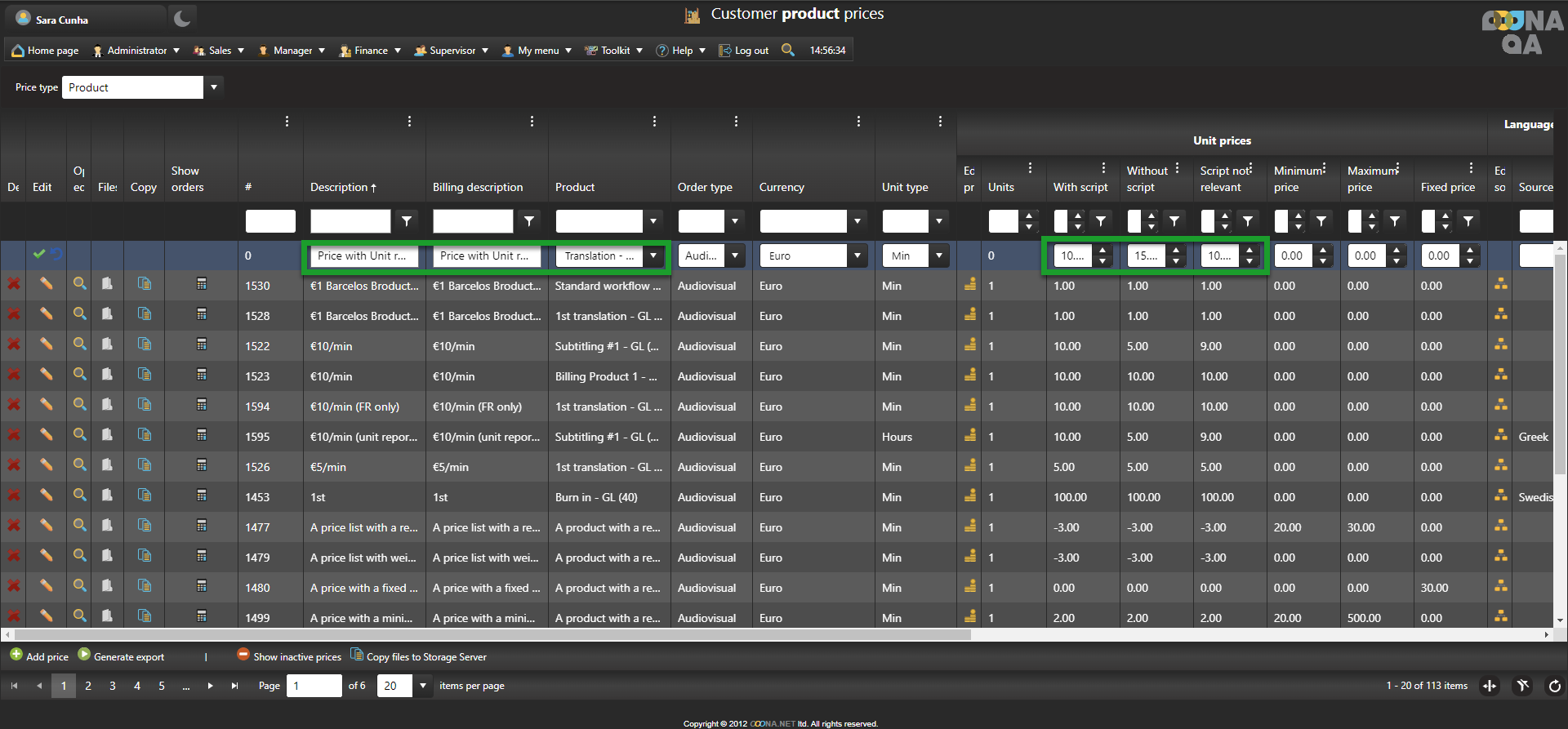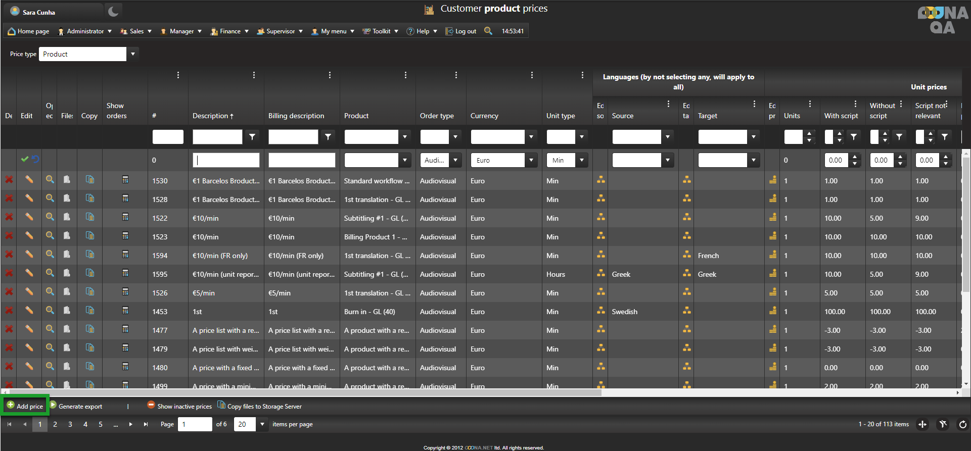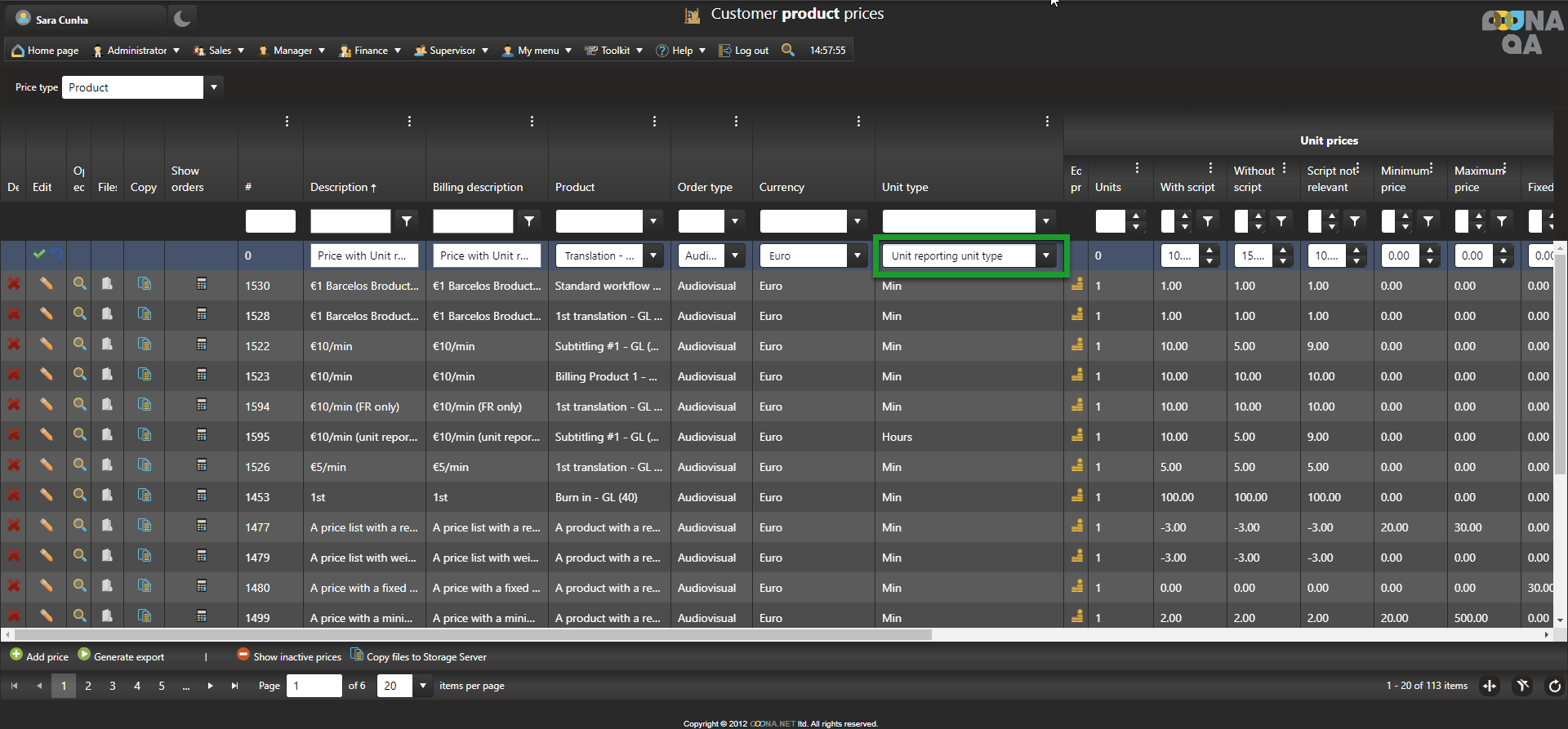 To create a price with Unit reporting, go to Manager > Price lists & Workflow templates > Customer prices, click “Add price” and a new editable row will be added to the grid.