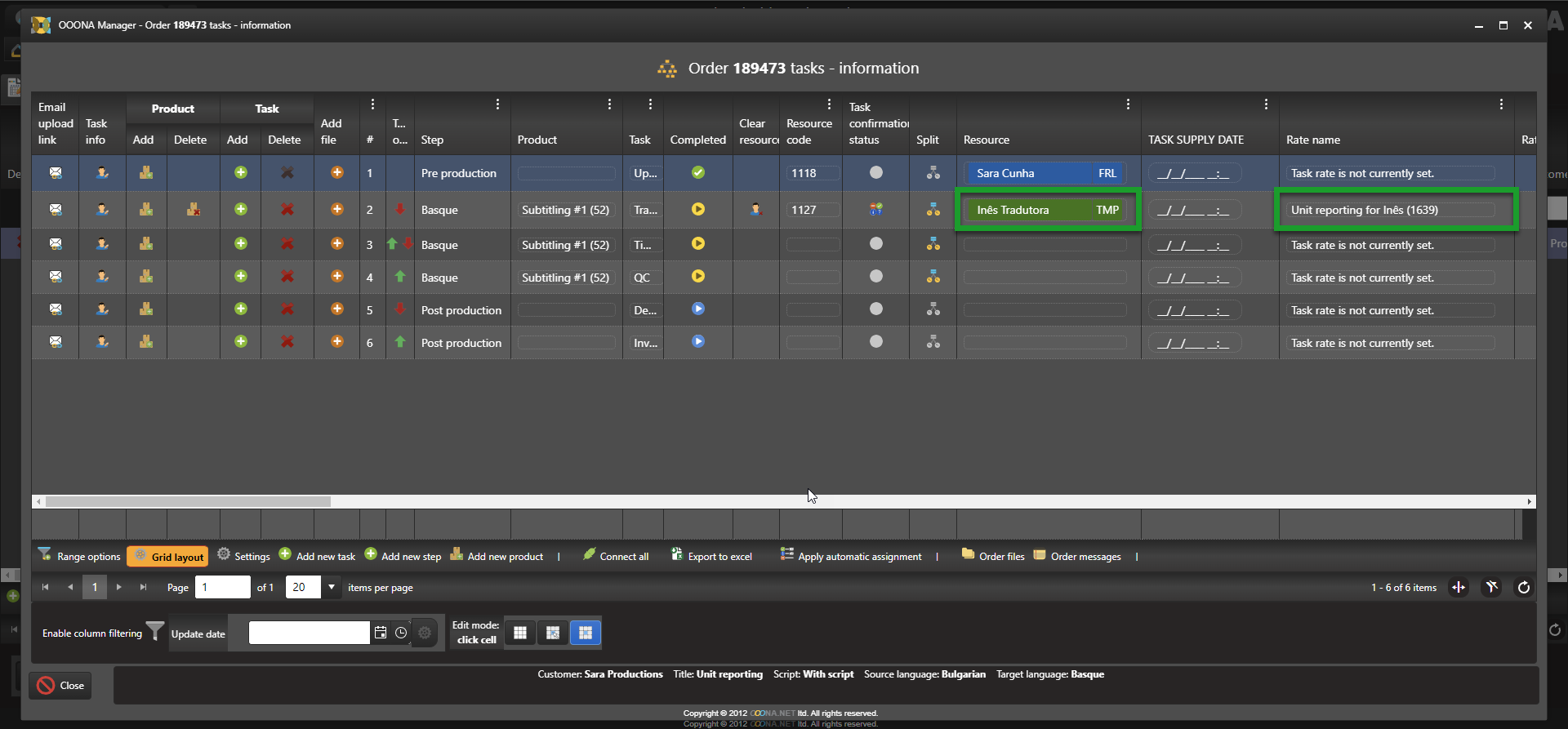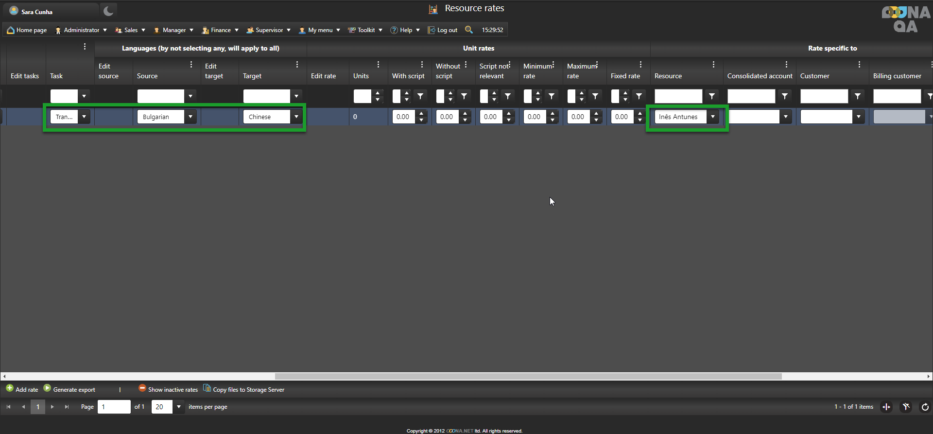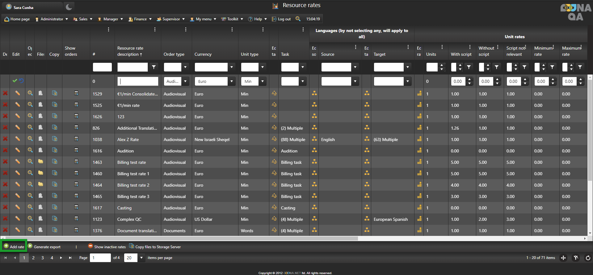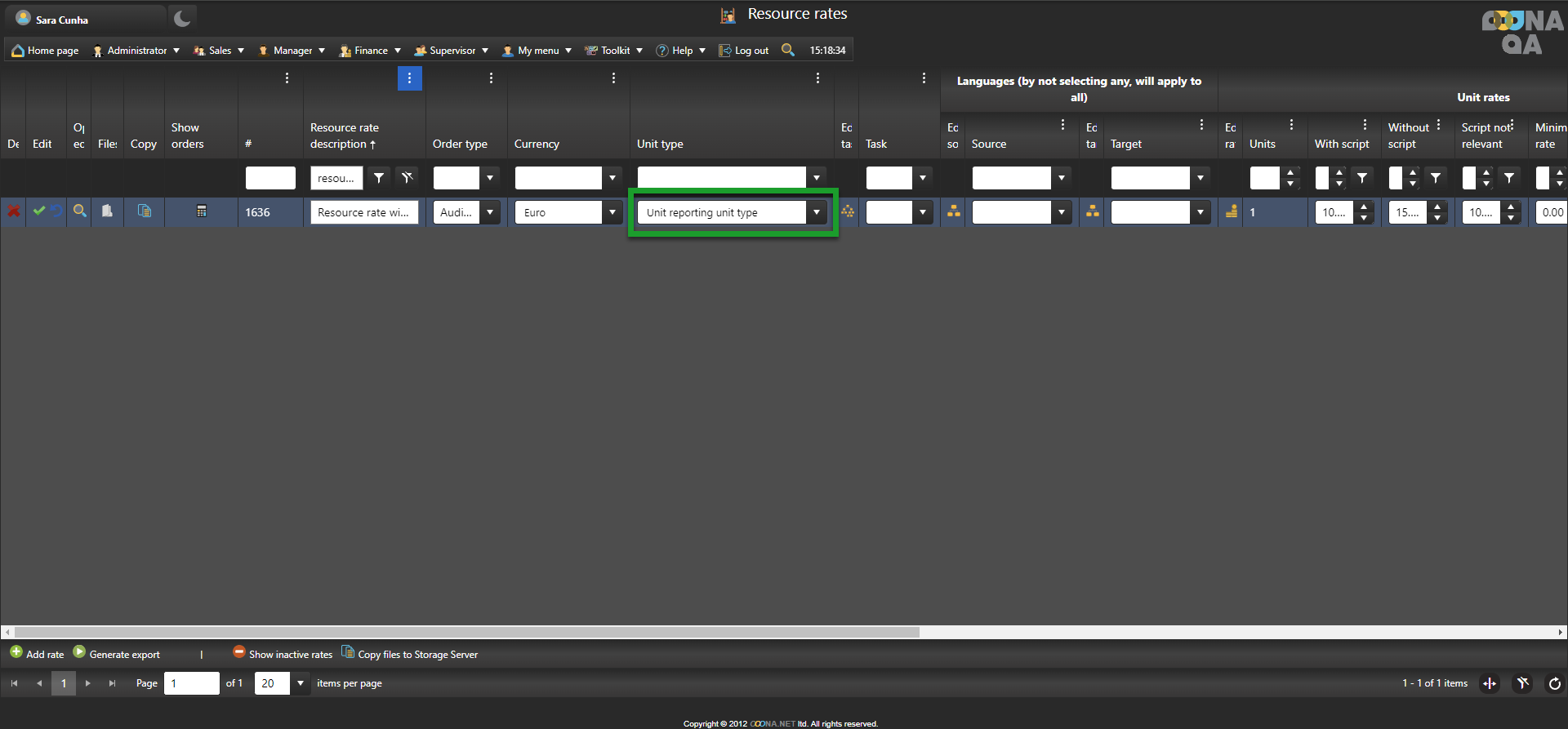 To create a resource rate with Unit reporting, go to Manager > Price lists & Workflow templates > Resource rates, click “Add rate” and a new editable row will be added to the grid.