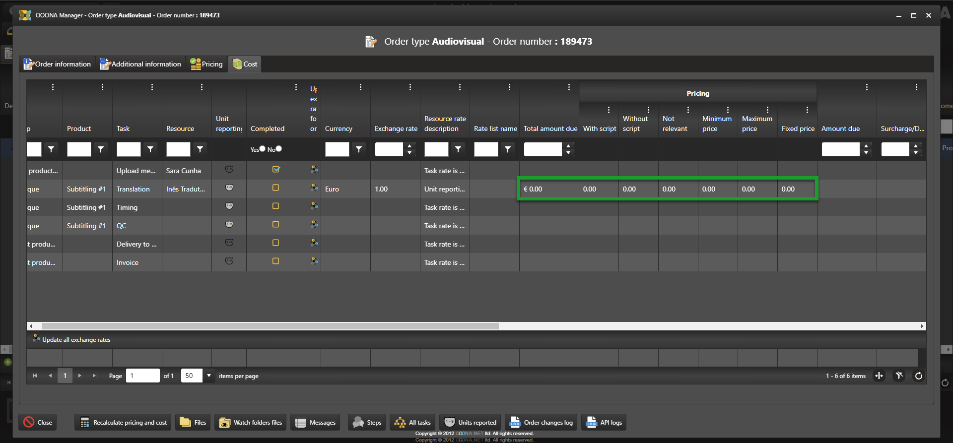 Note that the “Pricing” tab under Order info will only show customer prices and does not include rates, but the “Cost” tab shows both prices and rates.
